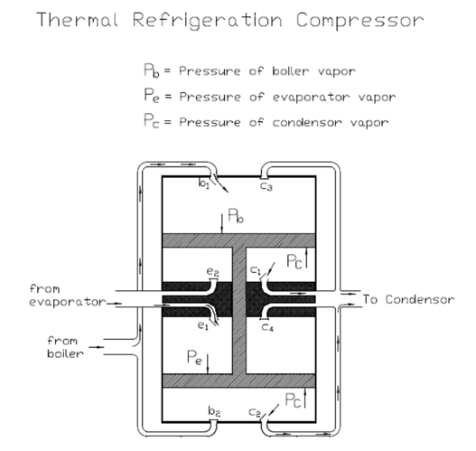The compressor is shown with four valves open, valves b1, e1, c1 & c2. The pressures involved are from boiler vapor pressure, evaporator vapor pressure, and condenser vapor pressure. Force equals the Pressure times Area of the piston so we can, in this instance, use force or pressure interchangeably in the equations. The boiler pressure plus the evaporator pressure, together, must be greater than the two condenser pressures: Pb + Pe > Pc + Pc. At the end of the stroke, the four valves close and the other four valves open causing the piston to return to its top position. The cycle completes and begins again as long as the pressures in the boiler and evaporator combine to be more than twice the pressure in the condenser.