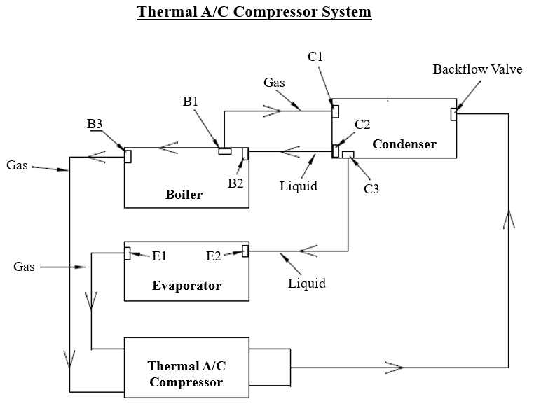 The design uses free energy in the attic temperatures. It starts working at a mere 20 ℉ (11 ℃) degrees temperature differential to make air conditioning and 34 ℉ (19 ℃) temperature differential to make a freezer work; if 10 ℉ (-12 ℃) is the desired freezer temperature. The higher the temperature differential the faster it works. So you can put the boiler in the attic, the compressor outside to cool down in ambient air, and the evaporator in the home to make refrigeration or air conditioning. The hotter the temperature gets in the attic the faster it will work and proportionately so, bringing down the temperature in the living space faster. The system is paired perfectly for the job. Or you could use a few solar thermal panels if for some reason to have to resort to that instead of the attic. In addition to this, you might find other uses for the hot and cold temperatures coming out of the compressor before they can get to the condenser.