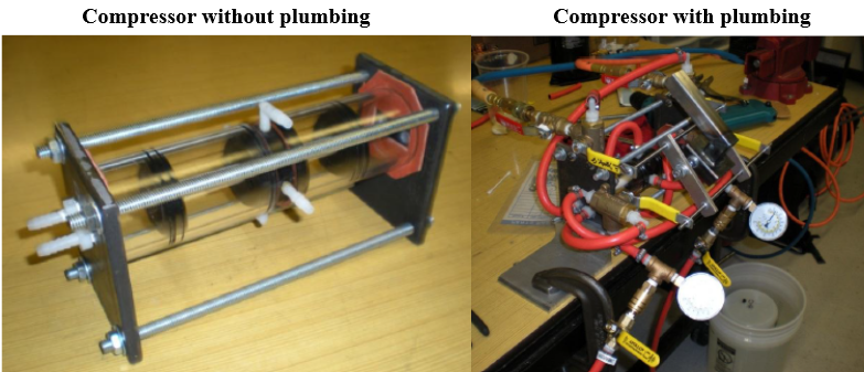 These pictures were in the report of the five-man engineering team of senior students. On the left is the bare compressor with the piston. The piston chamber was made with heavy plexiglass so that we could see the piston moving up and down to make sure it was working. This same thermal compressor can be reconfigured to make electricity. For more details, please see -Appendix for the full report, proof of concept, completed at University of Idaho.